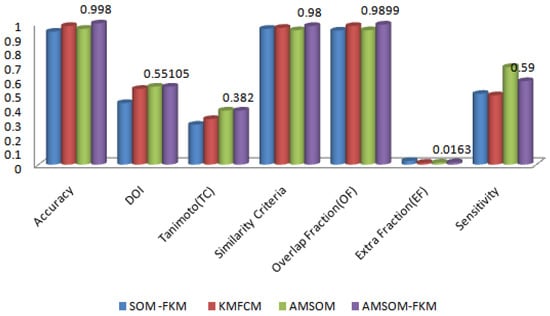 The proposed algorithm allowed neurons to change positions during training, providing better visualization and faster training time, as shown in Figure 11. Therefore, cluster numbers were adequate and accurate cluster points that adequately segmented tissue regions. The proposed algorithm also ranked higher in producing better DOI and TC values. The average DOI and TC values produced by the AMSOM-FKM algorithm were 0.435105 and 0.282381. The accuracy shown in Table 4 revealed that the proposed algorithm produced satisfactory results with 99.8% accuracy. Table 5 demonstrates the performance evaluation regarding the Dice score and Jaccard index below.