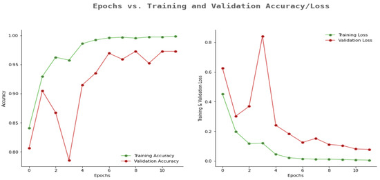 Similarly, Figure 12 shows the outcomes of the proposed model in terms of epoch and accuracy/loss results. The proposed model had better training accuracy and validation for more epochs. Additionally, we observed that training and validation loss were more elevated once the number of epochs was less. However, when the number of epochs increased, the training and validation loss was less.