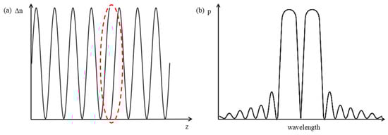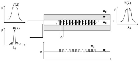 The FBG is a diffraction grating formed by the periodic distribution of the refractive index of the fiber core and fabricated normally using the phase mask method [19]. Its effect is equivalent to a narrowband filter or reflector, as shown in Figure 1.