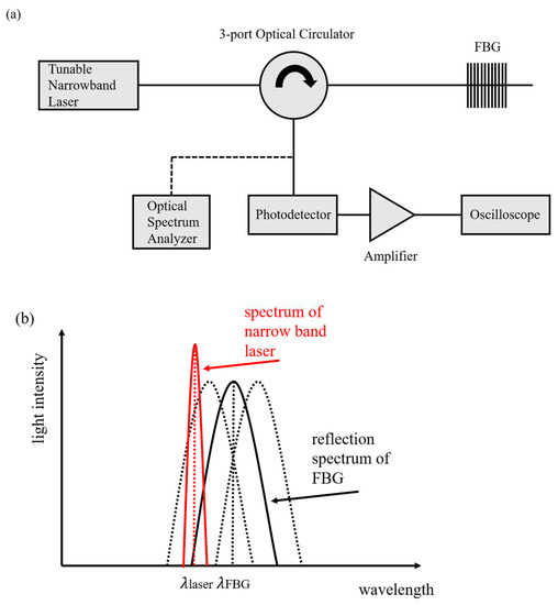 A tunable narrowband laser is used to convert the drift of the FBG center wavelength into the change in light intensity, which is then detected using a photodetector. The schematic diagram and principle of the system are shown in Figure 2.