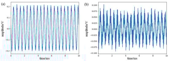 In order to confirm the sensitivity of the π-FBG, this paper used tape to attach the FBG and π-FBG to the steel plate with a coupling agent applied in between to reduce the signal loss, and then built the sensing system separately. The center wavelength of the experimental FBG is 1549.970 nm with a 3 dB bandwidth of 0.23 nm, and the center wavelength of the π-FBG is 1549.985 nm with a 3 dB bandwidth of 0.3 nm. We adjusted the center wavelength of the tunable narrowband laser to align with the maximum slope of the reflection spectrum of both, and kept the other conditions the same. The PZT was used to generate a standard sinusoidal signal at 100 KHz, and both FBGs were located at a distance of 10 cm from the PZT. The final signals acquired by both systems are shown in Figure 4, and it can be seen that both can detect the signals, but the π-FBG is about twice as sensitive as the FBG and has less distortion.
