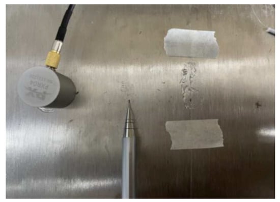 Further, we broke a pencil lead to simulate the acoustic emission signal to test whether the system can detect tiny acoustic emission signals. According to the requirements of the national standard GB/T18182-2000, the lead breaking signal (breaking a pencil lead) is used to simulate the acoustic emission signal. An HB 0.5 mm automatic pencil was used, and the pencil lead of the automatic pencil was extended by 2.5 mm, breaking at an angle of 30 with the steel plate surface. The pencil breaking position was 10 cm away from the fiber optic grating sensor. We also purchased a standard piezoelectric acoustic emission sensor for simultaneous detection for comparison. The pencil lead breaking point was 10 cm from the two sensors, respectively. The relative placement relationship of the experimental instruments is shown in Figure 5. From left to right, these are the piezoelectric sensor, the automatic pencil, and the fiber optic grating sensor.