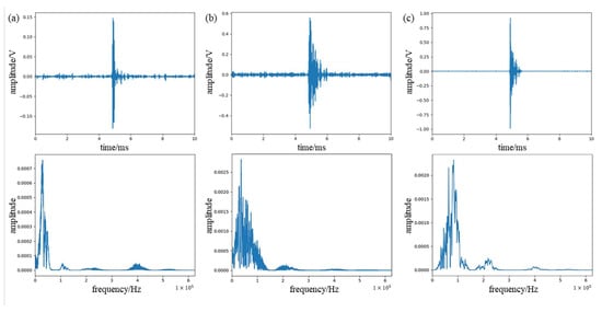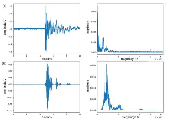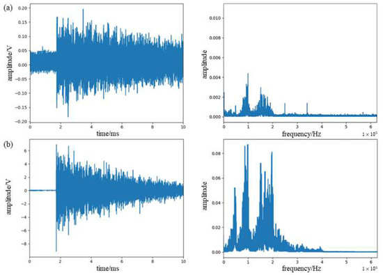 The detected signals and their frequency spectrum are shown in Figure 6. It can be seen from the figure that the detected signals of the two are relatively consistent, and the larger component of about 40 KHz in the measurement signal of the acoustic emission sensor is caused by its own resonance frequency. It can be demonstrated that this system can detect the acoustic emission signal, but the signal contains large noise that needs to be processed.