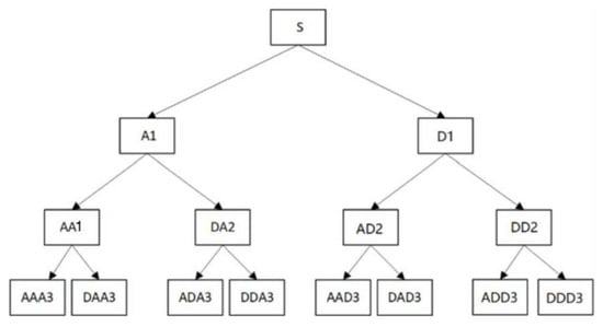 From the perspective of function theory, WPD is the projection of a signal into a space composed of wavelet packet basis functions, and from the perspective of signal processing, it is the decomposition of a signal through a series of filters with different center frequencies but the same bandwidth. It decomposes the signal into high-frequency subbands and low-frequency subbands step by step, which finally forms a subband tree structure. The diagram of a third-order wavelet packet decomposition tree is shown in Figure 7, where A represents the approximate filtering, which is the low-frequency part of the higher-level signal, and D represents the detail filtering, which is the high-frequency part of the higher-level signal.