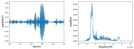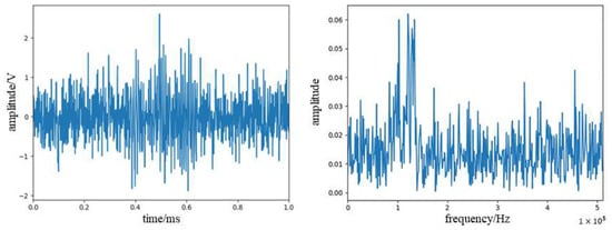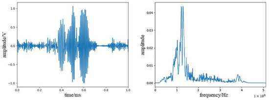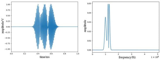 where 1 = 90 KHz, f2 = 100 KHz, 3 = 130 KHz, 1 = 0.4 ms, 2 = 0.5 ms, 3 = 0.6 ms, = 0.0001, = 0.00015, = 0.00018, the sampling rate is 1024 KHz, and the number of sampling points is 1024. The waveform and the frequency spectrum are shown in Figure 8.