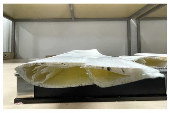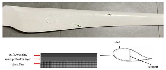 This paper takes a small wind turbine blade as an example to study under laboratory conditions, as shown in Figure 12. The wind turbine blade is mainly composed of a shell and an internal support. The support layer is made of glass fiber composite material, and the shell is wrapped with a resin protective layer and surface coating on the outside of the glass fiber composite material layer.