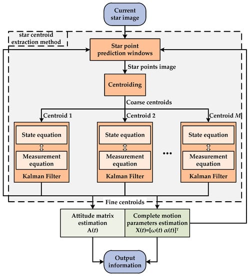 As shown in Figure 1, the proposed star centroid extraction method can be divided into three parts, i.e., star point prediction windows, centroiding, and Kalman Filter. Firstly, the star point prediction windows are generated by combining the fine centroids of the star spots in the former star image, as well as the complete motion parameters X(t) (including the angular velocity ω(t) and angular acceleration α(t)) [41]. The current star image will be processed by the star point prediction windows and then only the star points within the prediction windows can be transmitted to the next step. Secondly, the classic centroid method is used to calculate the centroids of the above star points. These centroids inevitably include many image noises and thus are just coarse centroids. Lastly, the coarse centroids are, respectively, processed by each Kalman Filter to filter the image noises and thus fine centroids are obtained. By using the fine centroids, both the attitude matrix and complete motion parameters can be estimated as the final output information. Meanwhile, the current fine centroids and complete motion parameters can be utilized to generate the next star point prediction windows. Therefore, the high-accuracy star centroid extraction can be constantly realized in such circulation.