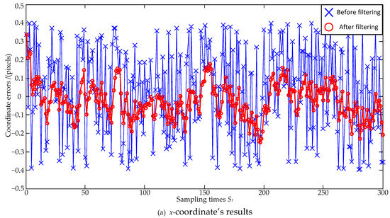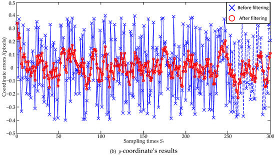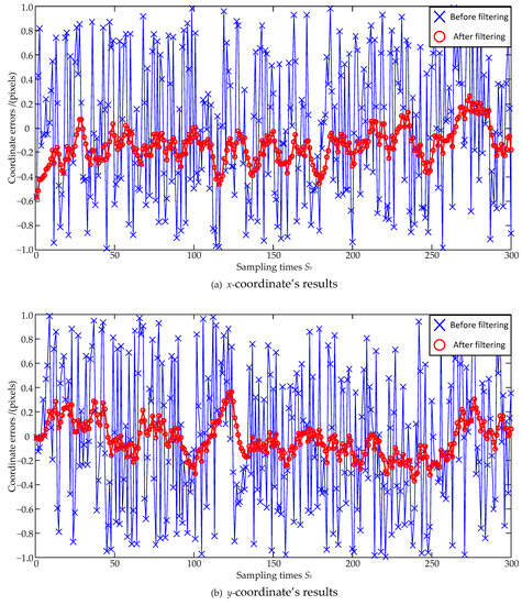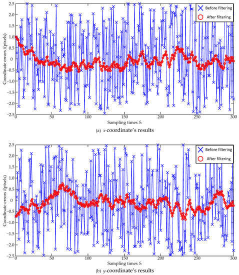The noise size is firstly set as a zero mean and ±0.4 pixel maximum deviation, and the estimation errors are shown in Figure 3 and Figure 4. In Figure 3, the standard deviations of the x-coordinate’s estimation errors are 0.24 pixels before filtering and 0.09 pixels after filtering, respectively; the standard deviations of the y-coordinate’s estimation errors are 0.23 pixels before filtering and 0.08 pixels after filtering, respectively. Both the standard deviations of the x-coordinate’s and the y-coordinate’s estimation errors are decreased, and the x-coordinate’s and the y-coordinate’s reductions can be, respectively, calculated as:
