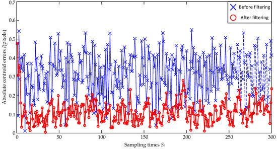 In order to make a reasonable evaluation, the larger value of 37.5% is selected as the evaluation result. That is to say, the coordinate errors are reduced to 37.5% of the original ones after the Kalman Filter estimation. In Figure 4, the absolute distance errors between the true and real values of the centroid are calculated, and it can be seen that the absolute distance errors are significantly reduced after filtering.