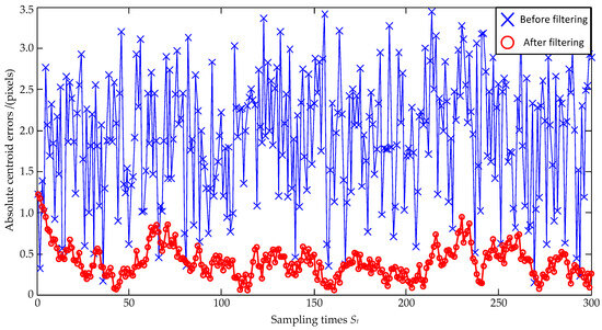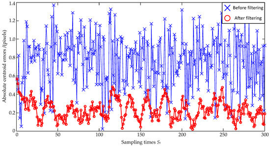 The entire simulations are run on a computer with a Windows 10 operating system and a CPU with a main frequency of 2.60 GHz. MATLAB (version: R2014a) is chosen as the simulation calculation software. The simulation process can be divided into several steps. Firstly, based on the star catalog of the Smithsonian Astrophysical Observatory (SAO), only stars with a magnitude of less than 6.0 are selected to build the MEISS’s navigation star catalog. Then, a set of attitude data is randomly generated as the MEISS’s initial attitude data, and a total of M = 30 navigation stars within the FOV are obtained under that attitude. Thirdly, the initial values of the angular velocity ω(t0) and angular acceleration α(t0) are assumed to be [10°/s 0 0]T and [1.0°/s2 0 0]T, respectively. Subsequently, among these 30 navigation stars, the 10th navigation star is randomly selected as the tested object. When the MEISS moves under the assumption of the above angular velocity ω(t0) and the angular acceleration α(t0), the centroid data of the 10th navigation star at continuous sampling times St, whose total sampling times are set as 300, can be obtained and used as the true values. Lastly, three kinds of different sizes of Gaussian white noise are added to the true centroid data and the Kalman-Filter-based estimation model is used to filter the noisy data.