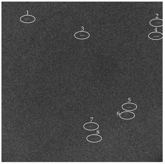 In Figure 10, there are, in total, eight guide stars within the star image, which are numbered as 1–8, and the rest is a starry background with noise. Since the multi-exposure times N is set as five, each guide star has five star spots. Furthermore, it can be seen that the noise level of the star image is relatively high. When using the global threshold segmentation (global threshold = 128) and classic centroid method, there are a total of 4985 objects. Among them, there are 3664 one-pixel objects accounting for 73.5% of the total, 749 two-pixel objects accounting for 15.0% of the total, and 572 over-three-pixel objects accounting for 11.5% of the total. Although most objects are false (one-pixel and two-pixel objects) and can be eliminated, the number of candidate star point objects is still large (572 over-three-pixel objects), which seriously hinders the accurate extraction of real star point objects. In contrast, when using the star point prediction windows for centroid extraction, only 8 × 5 = 40 star point objects are extracted, accounting for only 0.8% of the total. Similarly, under the same experimental conditions, another 99 star images are obtained to further verify the star point prediction windows. Among the 100 star images, the average proportion of the number of effective star point objects in the total object number of each star image is calculated as only 0.95%, which greatly demonstrates the effectiveness of the proposed method.