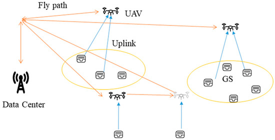 Currently, small unmanned aerial vehicles (UAVs) have shown promising application prospects in assisting wireless sensor networks (WSNs) with data collection and processing due to their high maneuverability, low cost, and no risk of human casualties [1,2,3,4]. Through the line-of-sight link between the UAV and the sensor devices or UAVs, high-speed data transmission can be achieved, which helps to meet the requirements of sensor data collection and transmission [5,6]. Moreover, UAVs have good environmental adaptability and operational flexibility. When the sensor devices are located in areas without network coverage, UAVs can be quickly deployed, on-demand, to expand the coverage range of the available network, thereby addressing the problem of communication failure between the sensor devices and the data center, and achieving efficient data collection regarding the sensor devices [7,8,9].