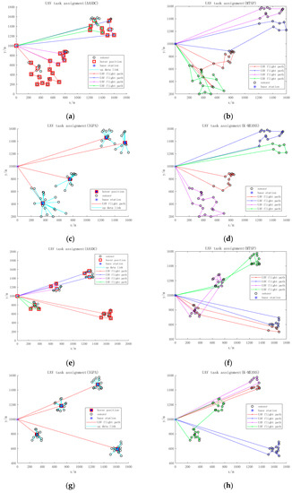 - MTSP-based algorithm (MTSP): This algorithm designs the task assignment of multiple UAVs by using the min–max Multiple Traveling Salesman problem (MTSP) algorithm.