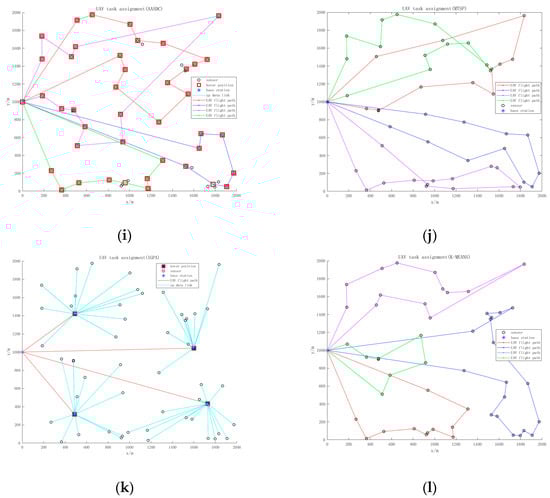 (a–l) reflects the data collection effects of AASDC, MTSP, IGPA, and KMEANS, respectively, using three distributions.