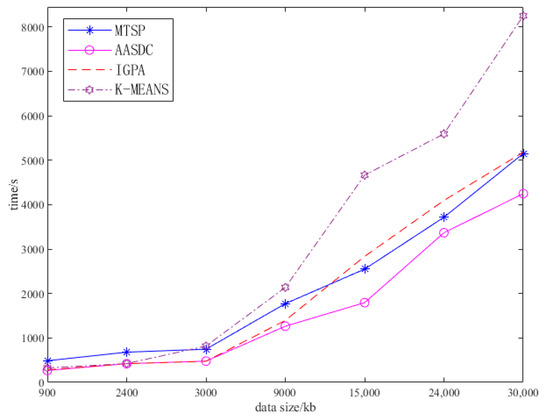 As shown in Figure 4, using different collection data sizes, we compared the average collection time of the proposed scheme and the comparison scheme using the proposed three sensor distributions. The horizontal coordinate is the amount of data comprising all sensors, and as the amount of data collected increases, so does the average acquisition time of the task’s completion time. When the data collected are less than 3 Mb, the collection time difference between algorithms is not obvious. However, when the data volume is greater than 9 Mb, the collection time of the IGPA algorithm increases rapidly, and the collection time of the MTSP and K-MEANS algorithms is slightly higher than that of the AASDC algorithm. When the amount of data collected reaches 30 Mb, the collection time of the MTSP algorithm and K-MEANS algorithm is about 10% higher than that of the AASDC algorithm. In the comparison algorithm, the KMEANS algorithm only performs clustering depending on the sensor location, without considering the influence of the sensor’s data and collection time. Although the IGPA algorithm considers the position of the sensor and the amount of data comprising the sensor, it takes a long time to collect the data of a few distant sensors in the hovering position of the UAV. The MTSP algorithm emerges directly above the sensor to collect data, ignoring that when the sensors are concentrated, the UAV can choose to collect data at a hovering point to reduce the collection time and flight energy consumption. The proposed AASDC distinguishes between dense points and sparse points during the collection process. The dense points do not move the position of the UAV, and the sensor in the sparse points emerges directly above to collect data; they can also distinguish between the distribution characteristics of the sensors to a greater extent. Therefore, the collection time of the AASDC is smaller than that of other schemes.