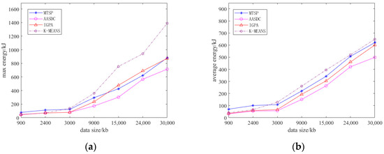 As shown in Figure 5, we compared the maximum energy consumption and average energy consumption of the proposed scheme with the comparison scheme for UAV use using different data collection systems. As can be seen from Figure 5a,b, when the proposed scheme collects the same data, the energy consumption of the UAV is less than that of other schemes. The difference in energy consumption between AASDC, IGPA, and KMEANS is not obvious, because there is little difference between the flight energy consumption and the collection energy consumption of the UAV at this time. However, the collection energy consumption of the UAV gradually increases with the increase in the amount of data collected. Compared with other schemes, AASDC adopts the method of simultaneously collecting data from multiple sensors in the area where sensors are concentrated. For the area wherein sensor distribution evacuation occurs, the sensor is flown directly above the point where data collection takes place, and condensation takes into account the distribution characteristics of the sensor, so the UAV energy consumption is reduced.