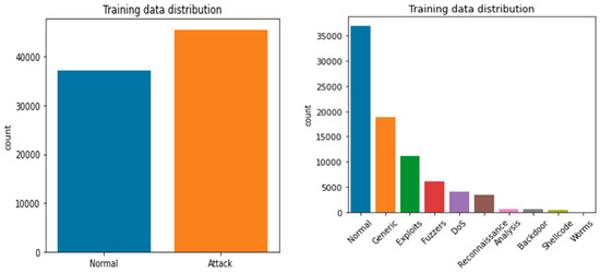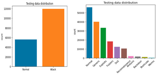 The UNB dataset contains normal, back-door, worms, reconnaissance, fuzzers, DoS, shell code, exploits, and generic data attributes [23]. The dataset includes 38,500 normal records, 950 back-doors, 174 worms, 978 reconnaissance, 7500 fuzzers, 4800 DoS, 978 shellcode, 12,440 exploits, and 18,554 generic. The detailed description of UNW-NB15 is represented in Figure 2 and Figure 3. Figure 2 presents the training and testing dataset, and Figure 3 presents the visual representation of the training and testing dataset.