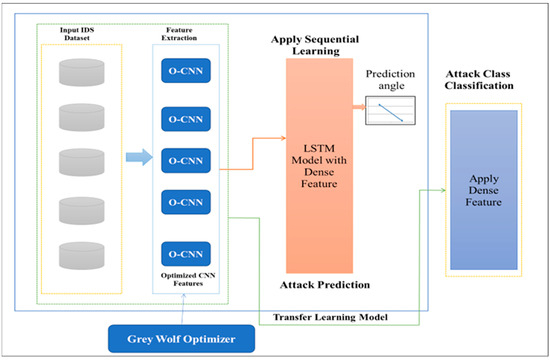 Figure 4 presents the architecture of the proposed HIDM model. The complete architecture is divided into three sections: optimized CNN, LSTM, and transfer learning. To enhance the CNN performance, we utilize fine-tuned parameters, i.e., learning rate, epoch, and weight; these all help optimize the CNN. The increased number of epochs in CNN helps to enhance the accuracy. The proposed model utilizes a GWO method [27] to optimize CNN hyperparameters.