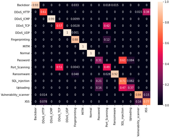 The ToN-IoT dataset contains attack classes and the numbers of instances for each class, wherethe details are as follows: normal, 79,638; denialofservice, 33,753; back-door, 50,811; distributed denialofservice, 61,650; MITM, 105; injections, 45,265; ransomware, 7280; scanning, 71,401; cross-site scripting, 21,089; and password, 17,185. Table 3 presents a detailed description of the ToN-IoT dataset.