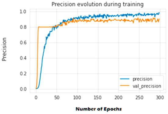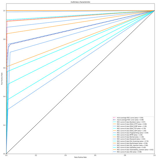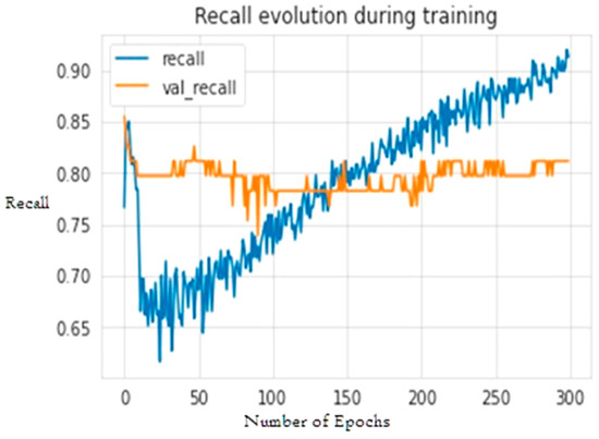 The second experiment calculates different simulation results for OCNN-LSTM [1] and OCNN-LSTM with transfer learning (proposed model). Figure 9, Figure 10, Figure 11, Figure 12, Figure 13 and Figure 14 present the simulation results for Experiment 2 of the proposed model for the ToN-IoT dataset. Figure 9 presents the simulation results for the confusion matrix of the proposed model, Figure 10 presents the loss function evolution during training, Figure 11 presents the accuracy evolution during training, Figure 12 presents the precision evolution during training, and Figure 13 presents the recall curve for training of the proposed model for UNW-NB15. Figure 14 presents the ROC curve for TPR vs. FPR in the proposed model for UNW-NB15.