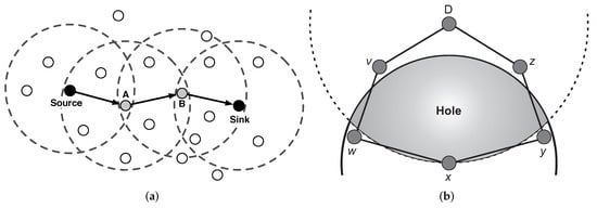 (a) Greedy path computing using geographical approaches []. (b) Local minimum phenomenon: a routing hole between x and D [].