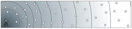 PAtCH considers that the sink node is equipped with a communication device powerful enough to reach all nodes deployed in the grid (sensing environment) in a single communication hop. The sensor nodes will receive the sink messages with different RSSI levels in such a way that most distant nodes receive the message with lower signal strength due to propagation issues (i.e., signal attenuation), as depicted in Figure 2. The efficient use of RSSI as a metric for localization systems has already been shown and discussed in [,,,]. The received signal strengths can be converted to estimated real distances, as already observed in [,]. This is a reasonable assumption, as discussed in Section 5. In addition, to simplify the understanding, the term distance estimations will be used instead of received signal strength.