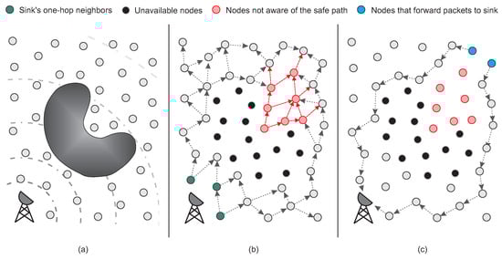 In the PAtCH algorithm, the RSSI values, disseminated by the sink node, are used both to generate flows to return the data packets back to the sink and to estimate the distance between a transmitter and a receiver, as depicted in Figure 3a,b. Our technique allows each node to choose a neighbor outside the hole region and, at the same time, be geographically closest to the sink node, as depicted in Figure 3c. This is possible because, after the propagation of the first query from the sink, regular nodes begin an announcement process of their estimated distance to the sink node to one-hop neighbors. Thus, the choice of which neighbor can forward the packet is computed based on the distance information obtained during the dissemination stage. An additional field is added to the packets sent during the dissemination stage of estimated distances. Such a field is used to allow the sink neighbors, i.e., nodes one hop away from the sink node, to be used as a reference to create secure paths for the flow of the packets. This extra information is used by the regular nodes to find a route toward the sink.