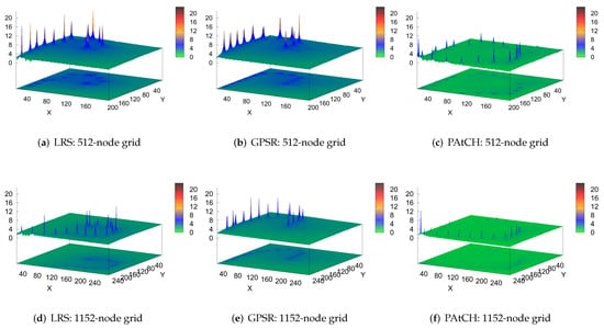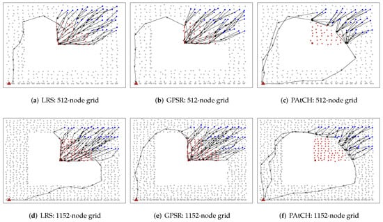 We also evaluate the impact of the excessive utilization of nodes located on the edge of the hole. In both the LRS and GPSR algorithms, all messages are already entered inside the hole, leading to the more frequent usage of the node that is trapped within the hole. The key feature of geographic routing approaches is the choice of a neighbor geographically closer to the final destination of the packets. In both GPSR and LRS, it is easy to see that the packages from the chosen nodes (blue nodes in upper right corner of Figure 4a–f) will enter the hole region and consequently get stuck in the node of the concave region of the hole. At the time the GPSR switches to perimeter routing mode, packets arriving at the trapped node will be routed through the perimeter of the hole. As depicted in Figure 7b,e, this repetitive behavior can lead to an increase in the size of the hole region, as the edge nodes will receive larger amounts of packets during the forwarding process.