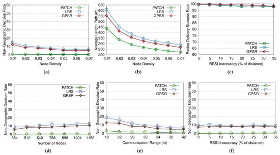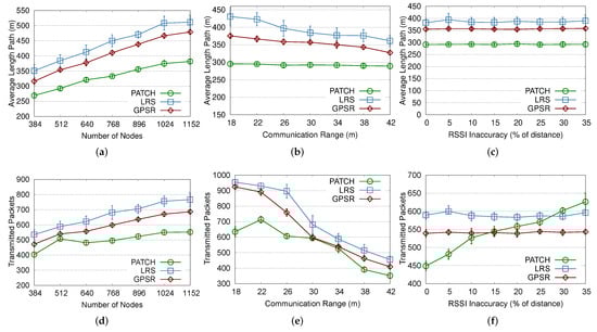 The RSSI inaccuracy was evaluated by increasing this imprecision from 0% to 35% of the real distances between nodes. As this value increases, there are more neighbors and, presumably, more reference points for sending and receiving packets. The LRS and GPSR approaches are not highly affected by the increased RSSI impression, as shown in Figure 5c,f and Figure 6c,f. However, as depicted in Figure 6f, we can see that the PAtCH algorithm is affected due the distance estimation when considering the number of packets transmitted towards the sink. It is important to remember that our novel location-free geographic routing mechanism depends on the values reported by both the sink and the regular nodes. Thus, the imprecision of the RSSI in the distance estimation process may affect the next hop decisions. Despite this result, our PAtCH algorithm can deliver more than 98% of the packets, is more effective in choosing the neighbor geographically closest to the sink, and, lastly, provides better paths toward the sink.