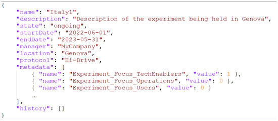 An example, minimal and dumb (for confidentiality reasons), of Experiment configuration file using the Hi-Drive protocol is provided in “Experiment Italy1.json” (Figure 2). As anticipated, the file specifies the values for this experiment of the basic descriptor fields (included the reference protocol) and of the contextual data (i.e., the metadata). A similar file is to be prepared by each experiment manager before the start of the experiment. As can be seen, the history list is initially empty.