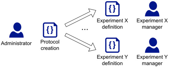 - Instantiate the project’s Experiments, specifying their Descriptor, Metadata, and referenced Protocol by uploading to the server the Experiment’s .json file (Figure 2). This step can also be performed through the Admin Dashboard GUI, without directly editing the file.