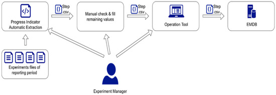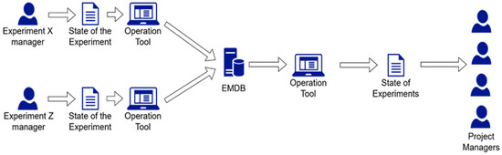Once configured, the EMDB is ready for receiving data from the various test sites. Each experiment manager can report the state of the experiment at a given history step by uploading a file (e.g., “Italy1#step2.csv” shown in Table 3) through the Operation Tool, a graphical user interface which will be described in the next subsection. Then, project managers can retrieve the state of all the Experiments present in the ADB. Experiment managers are allowed to update and retrieve data about their Experiment(s), while Project managers are allowed to retrieve data of all Experiments. Figure 5 provides an overview of the operation phase of the EMDB.