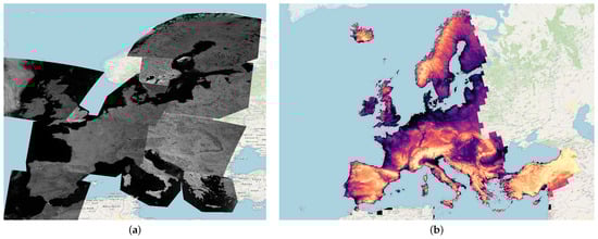 A total of 14 images were downloaded, spanning five years, from 2016 to 2021, with an acquisition time between the summer period, from May to September. Similarly to the practice adopted by Zhou et al. [], all images were chosen with a cloud coverage inferior to 10% of the acquisition. The images were loaded into the QGIS software as single raster layers, with the same datum, EPSG:4326 World Geodetic System 1984, considered for each. Figure 1a shows all the multispectral images collected by Sentinel-3 and properly merged to cover the entire European continent. It should be noted that, for the sake of visualization, all the downloaded images are visualized by showing their spectral average, and thus, the resulting patchwork effect is only a visual artifact.