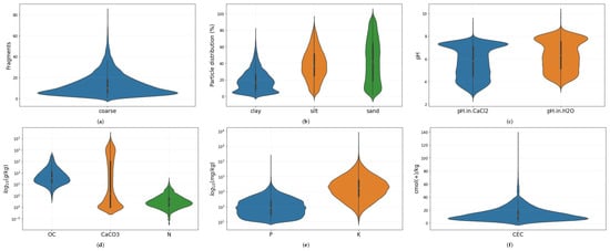 Violin plots of the soil properties considered in this work. (a) Coarse; (b) Clay, Silt and Sand; (c) pH in and ; (d) Organic Carbon (OC), Calcium Carbonate (CaCO3) and Nitrogen (N); (e) Phosphorous (P) and Potassium (K); (f) Cation exchange capacity (CEC). For the sake of visualization, the variables P, K and CEC are shown in a logarithmic scale.