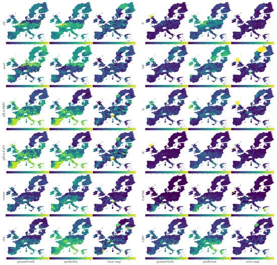For a visual comparison of the results, we render through inverse distance weighting (IDW) interpolation the ground points relative to the ground-truth, the predictions, and the errors in terms of RMSE of each soil variable. The blue and yellow colors represent the minimum and the maximum values of each soil property, respectively. Colors relative to intermediate values are obtained through quantile color coding. It is worth noting that in most cases, the ground-truth (the first image of each triplet) and the prediction (the second image) are visually similar, indicating an accurate estimation of the soil properties.