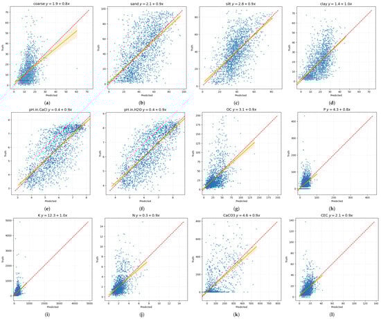 Scatter plots corresponding to the predictions of ANN Multi in relation to the soil parameters. The x axis refers to the predictions, while the y axis refers to the ground-truth values. For reference, each plot includes the perfect prediction line (dashed red) and the trend line relative to the estimations (solid orange). Each subfigure represents the scatter plot of a given soil variable.