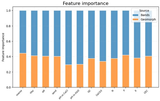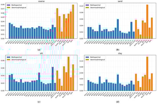 Aggregated feature importance of each soil variable. The contributions of the multispectral and geomorphological DEM derivatives are shown in blue and orange, respectively. It is worth noting that the importance of the multispectral variables is greater than that of the DEM derivatives.