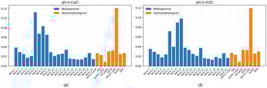 Feature importance of each soil property obtained using random forests. The blue bars represent the importance of the multispectral bands, while the orange bars are relative to the DEM-derivatives. (a) Coarse; (b) Sand; (c) Silt; (d) Clay; (e) pH in ; (f) pH in .