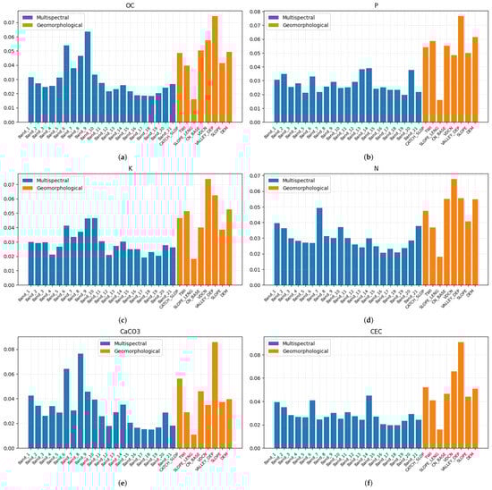 Feature importance of each soil property obtained using random forests. Blue bars represent the importance of the multispectral bands, while orange bars are relative to the DEM-derivatives. (a) Organic Carbon (OC); (b) Phosphorous (P); (c) Potassium (K); (d) Nitrogen (N); (e) Calcium Carbonate (CaCO3); (f) Cation exchange capacity (CEC).
