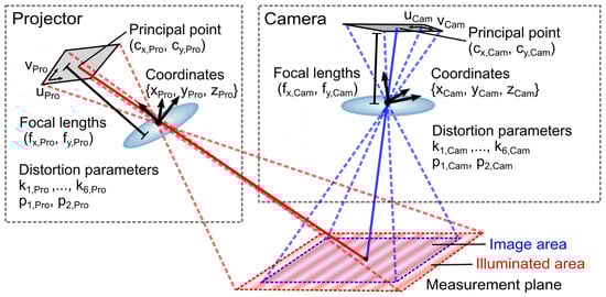 Figure 2 shows a schematic illustration of the pinhole camera model for a camera–projector system typically used for SFDI. In this case, both the camera and the projector are described individually by the pinhole camera model with its own set of parameters and coordinates.