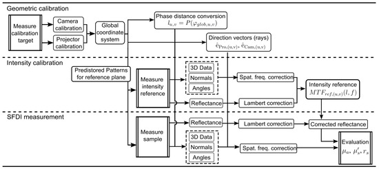 The presented approach of a two-step geometry and intensity calibration allows a comprehensive and coherent description of the entire SFDI system with a large set of internal and external parameters obtained both for the projector and camera. In combination with the 3D topography of the sample, available through the phase information, local changes in spatial frequency or intensity can be determined directly from the displacement or tilt of the sample surface and taken into account in a further analysis. This allows the investigation and further development of correction methods that require virtually no prior knowledge of the setup. The parameterized approach to phase–distance conversion and intensity correction using rays associated with an individual camera and projector pixels provides an efficient and insightful representation of the measurement process and subsequent data processing. A general drawback, however, is the extensive algorithms that must be developed and implemented once for post-processing.