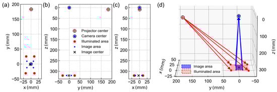 (a–c) 2D representation of the virtual camera and projector center, the illuminated area and the image area in the global coordinate system as they result from the geometric calibration. (d) The corresponding 3D illustration with the outer corner rays of both the camera (blue) and projector (red).