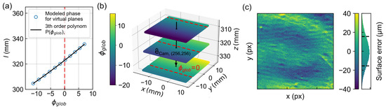 The geometric calibration allows the translation of the measured and unwrapped phase directly into a distance according to Equation (7). To determine this correspondence, ten virtual planes were defined in the calibrated volume, having been shifted in the z-direction. The projected phase as seen from the camera was then calculated for each plane using the known imaging model, shown exemplarily in Figure 7a for the pixel in the center of the camera. By fitting a third-degree polynomial according to Equation (7), the unique phase–distance relationship can be determined and stored for each pixel. In the subsequent measurement, it is sufficient to specify the camera pixel index, the phase value and the camera ray to calculate or, according to Equation (8), the corresponding 3D coordinate directly. Figure 7b shows three depicted planes in a 3D representation with color-coded , which can be assigned to a specific column of the DMD chip according to Equation (5). Due to the oblique projection direction, appears in the camera image at a different position in each plane. The black arrow again represents the camera ray of the center pixel. For validation, a flat reference target was measured in the reference plane and its 3D topography was determined using the phase–distance conversion. Figure 7c shows the surface error of the obtained point cloud determined by the regression of a plane to an average deviation of about .