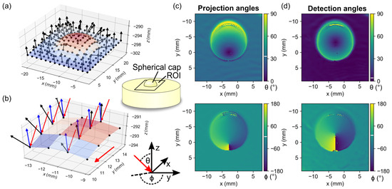 To illustrate the determination of the projection and detection angles, a custom-made planar phantom with a central spherical cap with a diameter of approximately 10 mm was measured. Figure 8a shows the 3D point cloud obtained by the phase–distance conversion, with pixel binning chosen for clarity. The black arrows illustrate the normal vectors computed for each pixel, while the color map codes are . Figure 8b shows an enlarged section of the point cloud with the additional representation of the camera rays (blue) and projector rays (red) as well as the propagation direction of the fringe pattern (red). Figure 8c,d show the polar angles calculated according to Equation (14) for projection and detection, respectively. The incidence angle of the projection is on average 35°, the detection angle of the camera is about 4° and and are on average 0°.