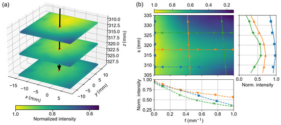 For the intensity calibration, a white coated, highly scattered aluminum plate with known reflectance properties was used as a reference target for further intensity calibration. It was measured at six different positions in the calibrated volume, each at nine spatial frequencies ranging from to . Figure 9a shows the corresponding DC images for measurements at three positions with a respective distance of 10 mm. It can be clearly seen that the intensity distribution is not homogeneous and changes laterally as well as for different heights. The black arrow marks the camera ray associated with the pixel at the center of the CCD chip. Figure 9b shows, for this pixel, the corresponding reflectance reference map obtained by an 2D interpolation of the acquired measurements. It shows the color-coded reflectance for this pixel as a function of distance from the camera along and as a function of the spatial frequency f. The outset on the right shows three intensity profiles as a function of but constant spatial frequencies at , and , corresponding to the vertical lines in Figure 9a. In all three cases, the intensity decreases at short and long distances due to the limited depth of field of the camera. The intensity maximum at 316 mm indicates the distance of the camera focal plane. The outset below shows the change in intensity as a function of the spatial frequency for three fixed distances at about , and . These curves correspond to the horizontal profiles in Figure 9a. Fringes with a high spatial frequency can obviously only be resolved properly near the focal plane, at distances from approx. ; the decrease of the MTF indicates blurring.