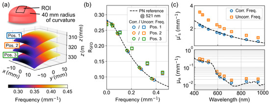To evaluate the influence of frequency and intensity corrections on the determination of optical properties, another custom-made hemispherical phantom with a radius of curvature of 40 mm was measured at three different positions in the calibrated volume. The SFD measurement was performed at all nine available wavelengths recording six spatial frequencies between and , with respect to the reference plane, and three phase patterns each. Figure 10a shows the three measurement positions where Pos. 2 was approximately at the reference plane and Pos. 1 and Pos. 3 were 10 mm above and below it, respectively. The false colors show the geometrically corrected spatial frequency due to the offset and curvature of the sample for a spatial frequency of . A clear gradient between and becomes apparent, which increases with shallower angles between the illumination direction and normal surface. Averaged over the entire field of view, the curvature causes about 15% deviation of the spatial frequency relative to the reference plane, and the height difference between Pos. 1 and Pos. 3 causes an additional variation of about 6%. Figure 10b shows at a wavelength of compared for the post-processing with and without consideration of both the spatial frequency correction and intensity correction. For comparison, the dashed line shows a forward calculation with a semi-infinite solution of the RTE. As a reference, the optical properties were determined by means of an integrating sphere as and , assuming the anisotropy factor and refractive index . While the measured is shifted to higher spatial frequencies and intensities without corrections, it agrees well with the prediction for all three positions with corrections. The deviations at low spatial frequencies probably result from the deviation from the assumed semi-infinite model. Figure 10c shows the corresponding optical properties for all wavelengths compared with and without correction, with the results of an integrating sphere measurement given as a reference. Without corrections, the deviations for and average 35% and 45%, respectively, over all wavelengths, while the deviations with a frequency correction are 5% and 12%, respectively.