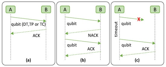 Figure 1 describes the QARQ protocol, where we consider a quantum communication system consisting of two quantum nodes, namely Alice (A) and Bob (B). The quantum channels (solid lines) are used to transmit qubits from A to B by means of DT, TP, or TC, while the classical channels (dashed lines) are used to exchange classical messages between them. As in classical ARQ, QARQ uses acknowledgements (ACKs) and timeout messages to achieve reliable quantum communication over an unreliable quantum system. Alice may send the quantum data with error detection codes, e.g., repetition codes to check whether the quantum data are received correctly. If no error is detected, B notifies A using a positive ACK (PACK) via the classical channel and the quantum memory is flushed (Figure 1a). Conversely, if an error is detected and it cannot be recovered, B discards the quantum data and sends back a negative ACK (NACK) (Figure 1b). When A receives the NACK, the cloned quantum data stored in the quantum memory are sent to B. Additional retransmissions can be performed if more clones are generated but at the expense of the degradation of qubit fidelity, as previously introduced. Moreover, QARQ sets timeouts for retransmission, where A uses the stored qubits if no ACK is received after a specified time period (Figure 1c).