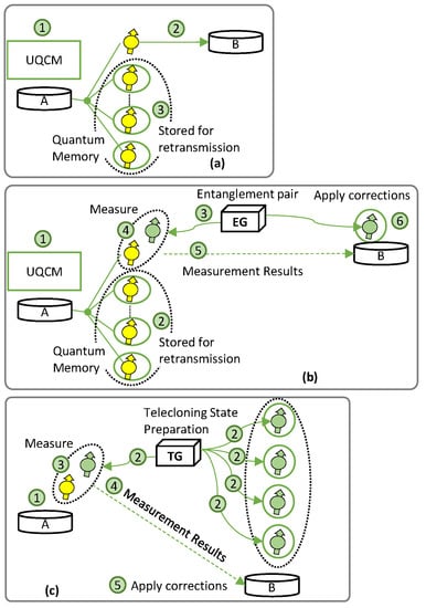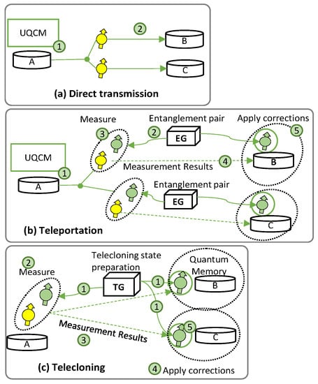 - During the transmission phase in DT, clones are sent to B via the quantum channel, whereas in TP and TC, clones are sent by the TP and TC protocols (see Section 2).