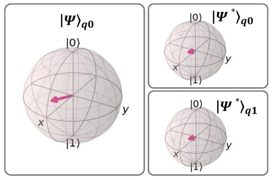 Figure 4 shows a case where the UQCM generates two clones’ states |Ψ*⟩q0 and |Ψ*⟩q1 of a qubit q0. These are prepared in a random state |Ψ⟩ (|Ψ⟩q0). These clones can be used either for DT or TP in QARQ or QP2MP. The following gates are used: