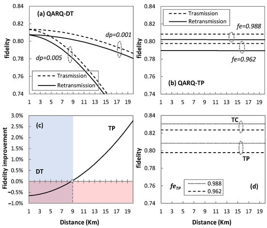 In Figure 6a for QARQ-DT, we observe the fidelity of the transmitted and retransmitted qubit. The fidelity of the qubit in DT highly depends on the length of the quantum channel and degrades faster as dp increases (from 0.001 to 0.005 in Figure 6a). This leaves the QARQ-DT protocol as an unsuitable candidate for long-distance transmission as QARQ performance depends on fr (see Table 1). The degrading effect of distance is not observed in Figure 6b, when teleportation is used, since fr mainly depends on the entanglement fidelity (feTP) of entanglement pairs and not on the distance. feTP represents the end-to-end fidelity of the pair once desired ends are reached. However, feTP depends on the distance traversed by entanglement pairs during distribution. To cater this effect, we consider imperfect feTP (0.988 and 0.962 in the case of Figure 6b). Remember that entanglement distillation can be performed to achieve the desired entanglement [], which is out of the scope of this paper. This suggests that QARQ-TP might be a better solution for longer distances. Comparing both solutions, we observe in Figure 6c that DT provides better fidelity in short distances (up to 9 km, shown by coloured regions in Figure 6c), whereas QARQ-TP is superior for longer distances.